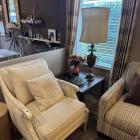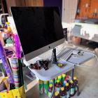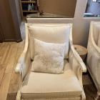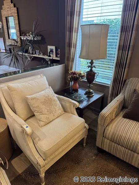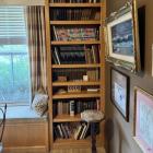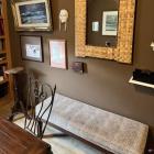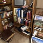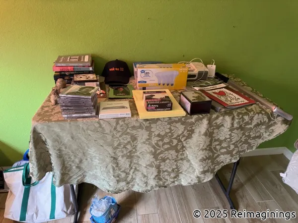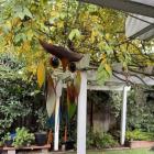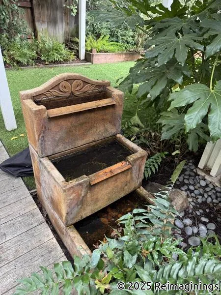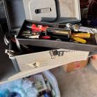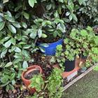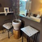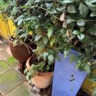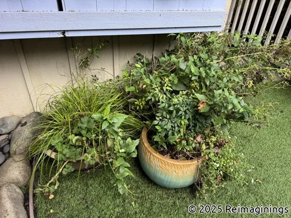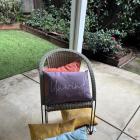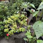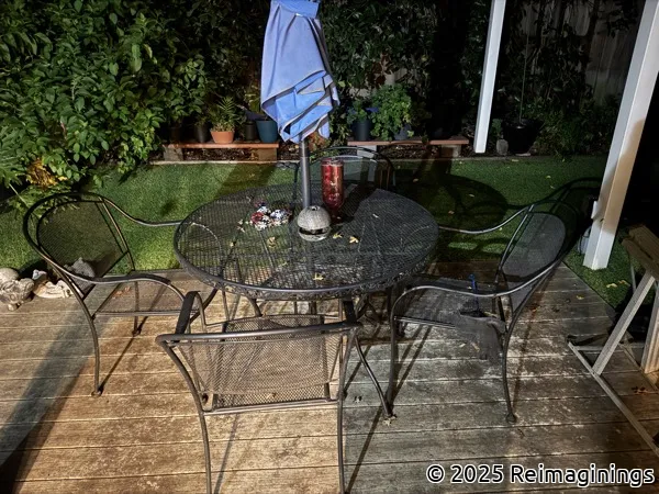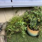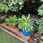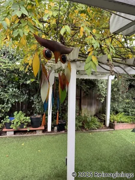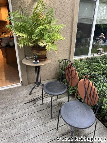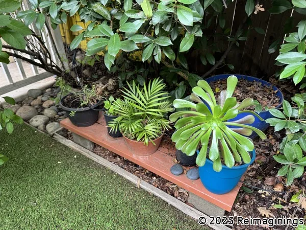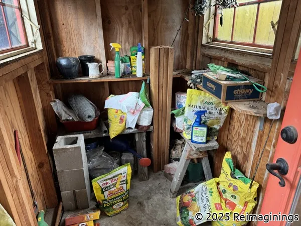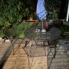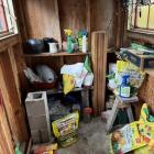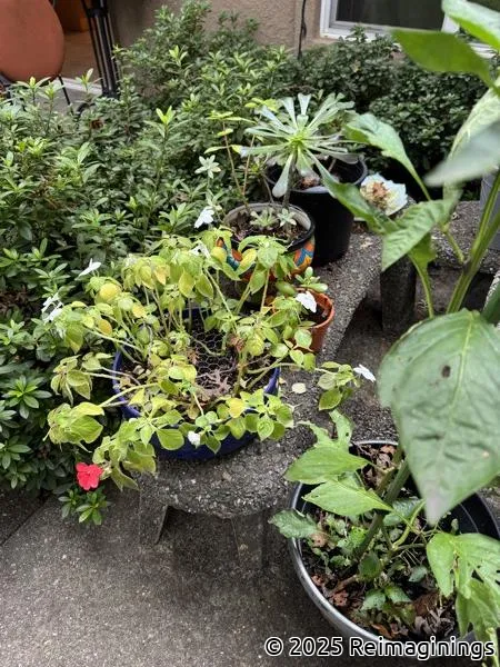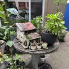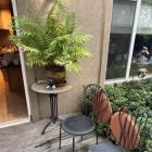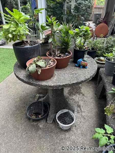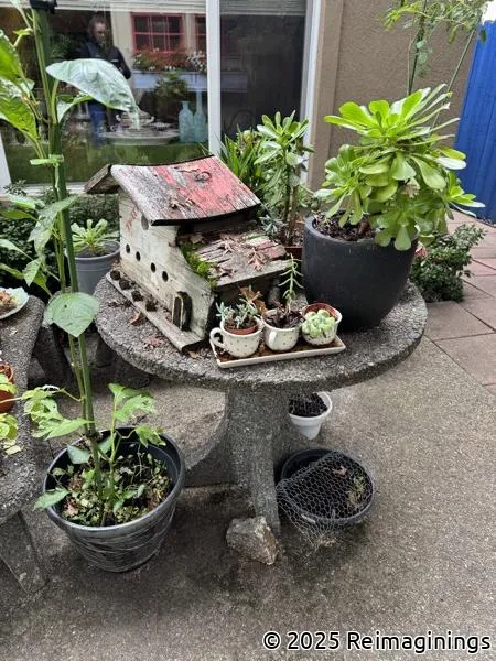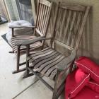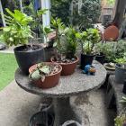 -lots of gardening supplies, yard tools, plants, yard art, cement table and benches, wood rocking chairs, wind chimes, nice metal outdoor table sets with umbrella, ladders, outdoor pillows, ceramic pots, metal garden bench