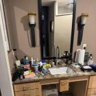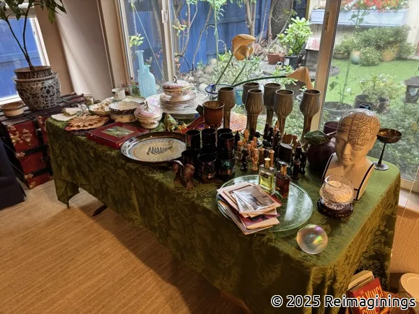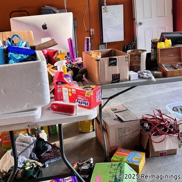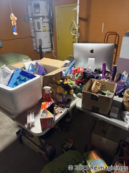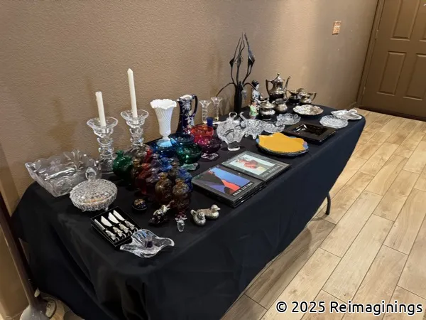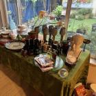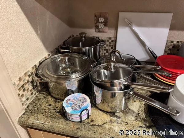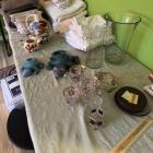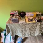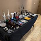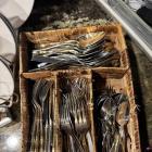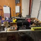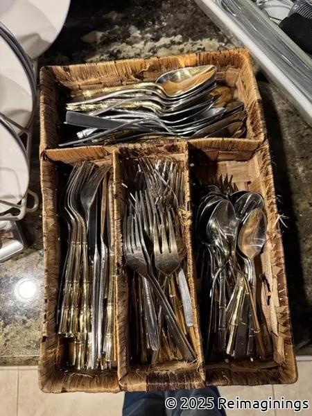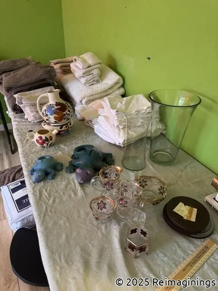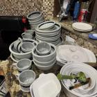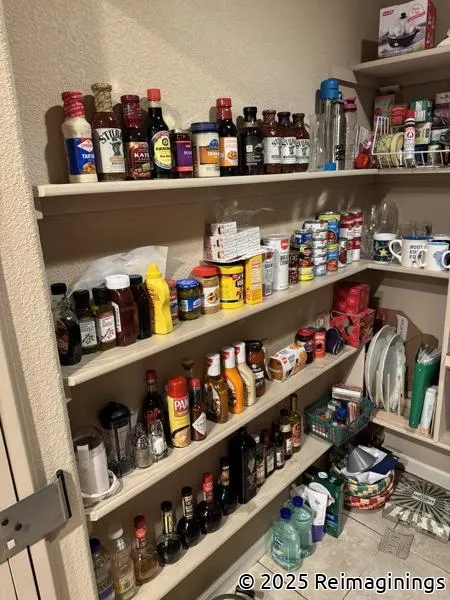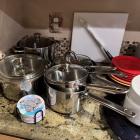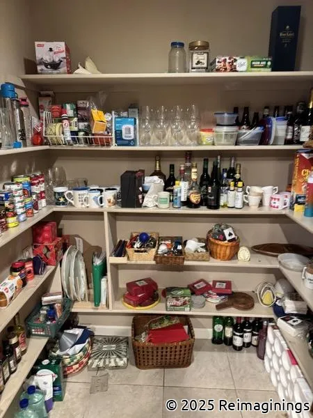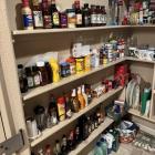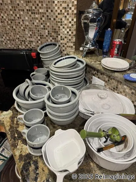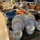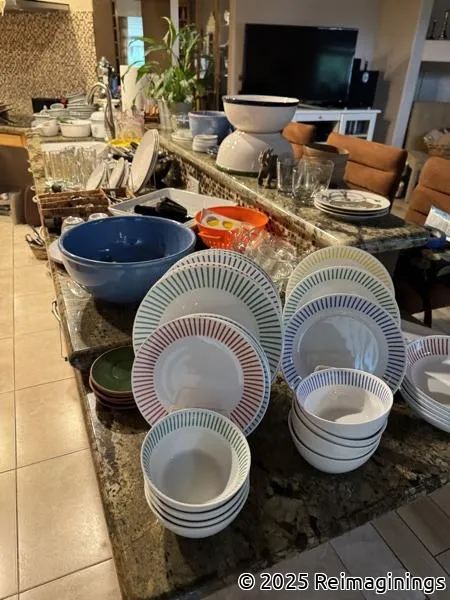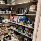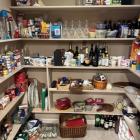 -kitchen items, food, silverware, pots/pans, dishes, glasses, bowls, lots of pantry items, serving pieces