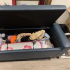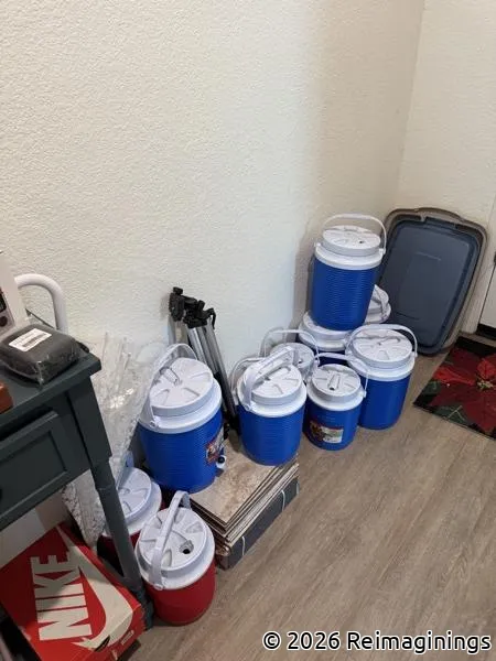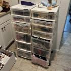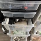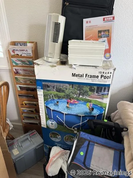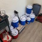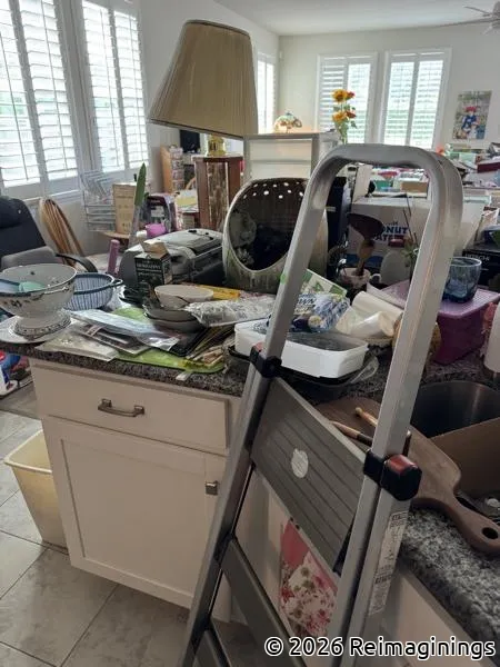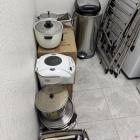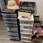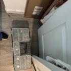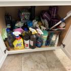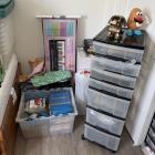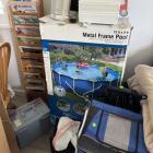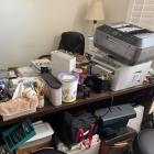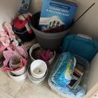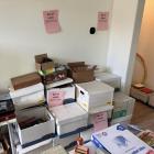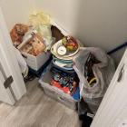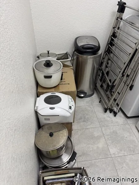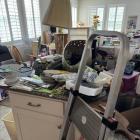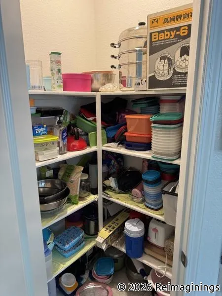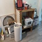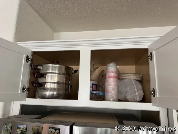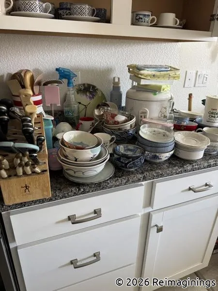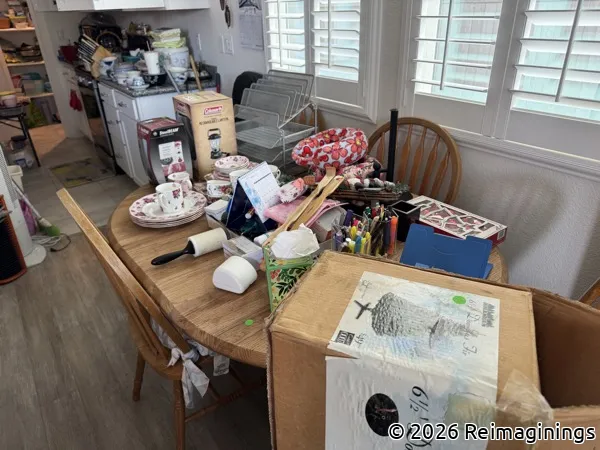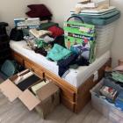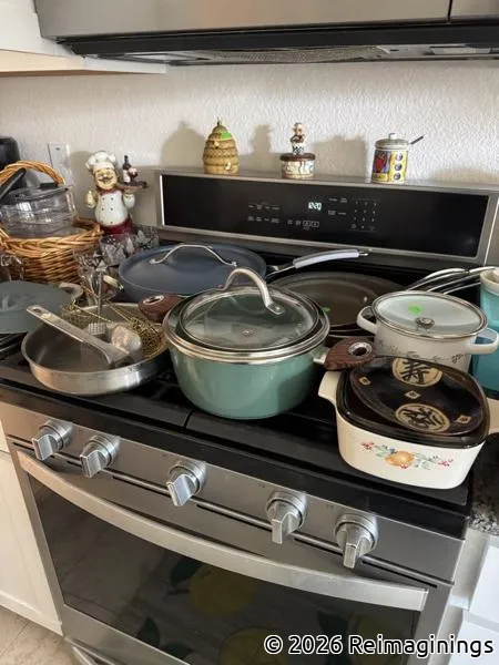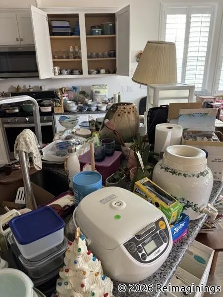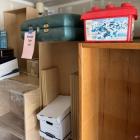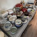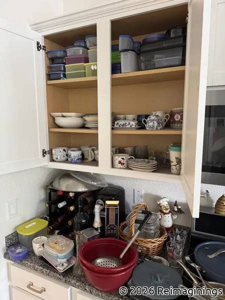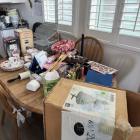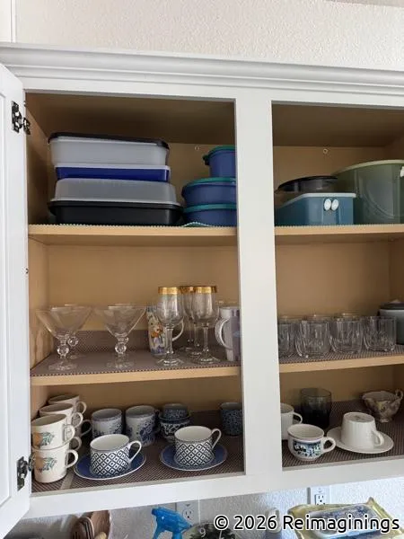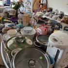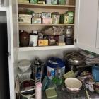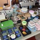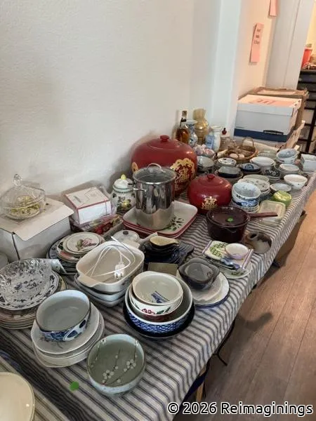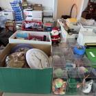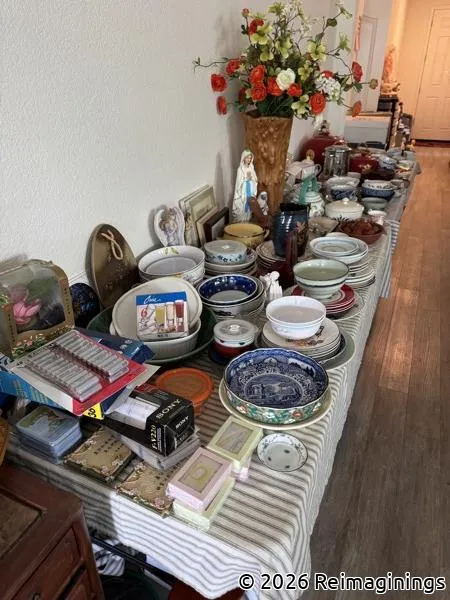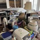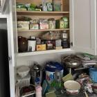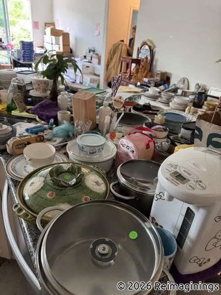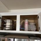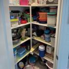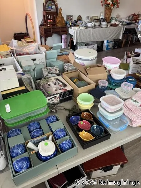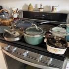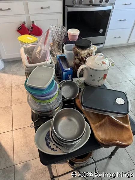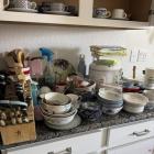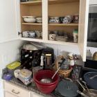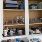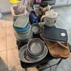 -lots of kitchen items, plates, cups, plates, pots and pans, silverware, Tupperware, serving pieces, glasses